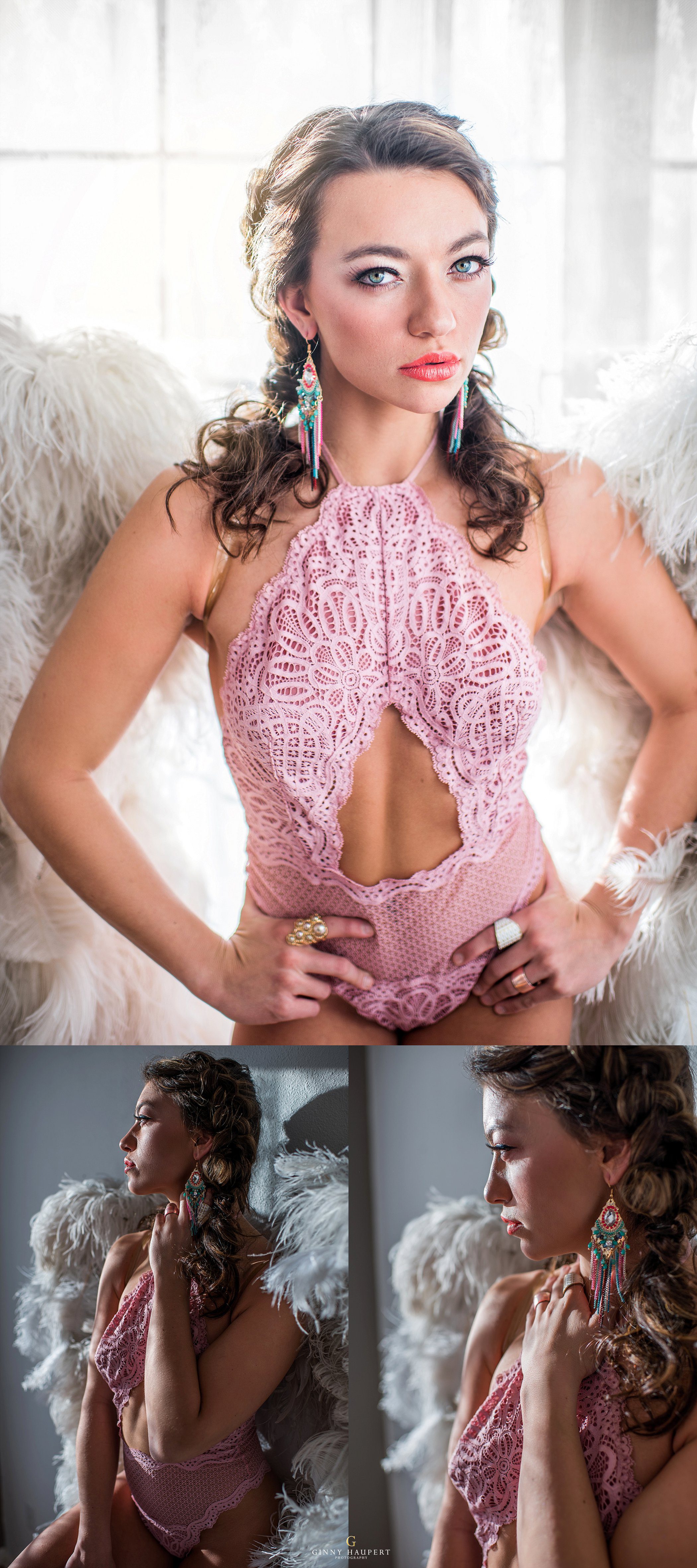 Our other looks we shot indoors. As a Denver Glamour Photographer, I strive to add glam to everything! The way the lace curtains lit up for this next look added that perfect touch of elegance. I had this fun Pink Floyd bodysuit that I had found a Target months ago that had just been waiting to be shot in. Lauren rocked this look. Her edge and sexiness matched our mood to at T. Nikki gave her pretty inside out French braids to give her a playful vibe. We quickly threw on a pretty bodysuit Lauren brought as well for a VS inspired look. Her session was a ton of fun!