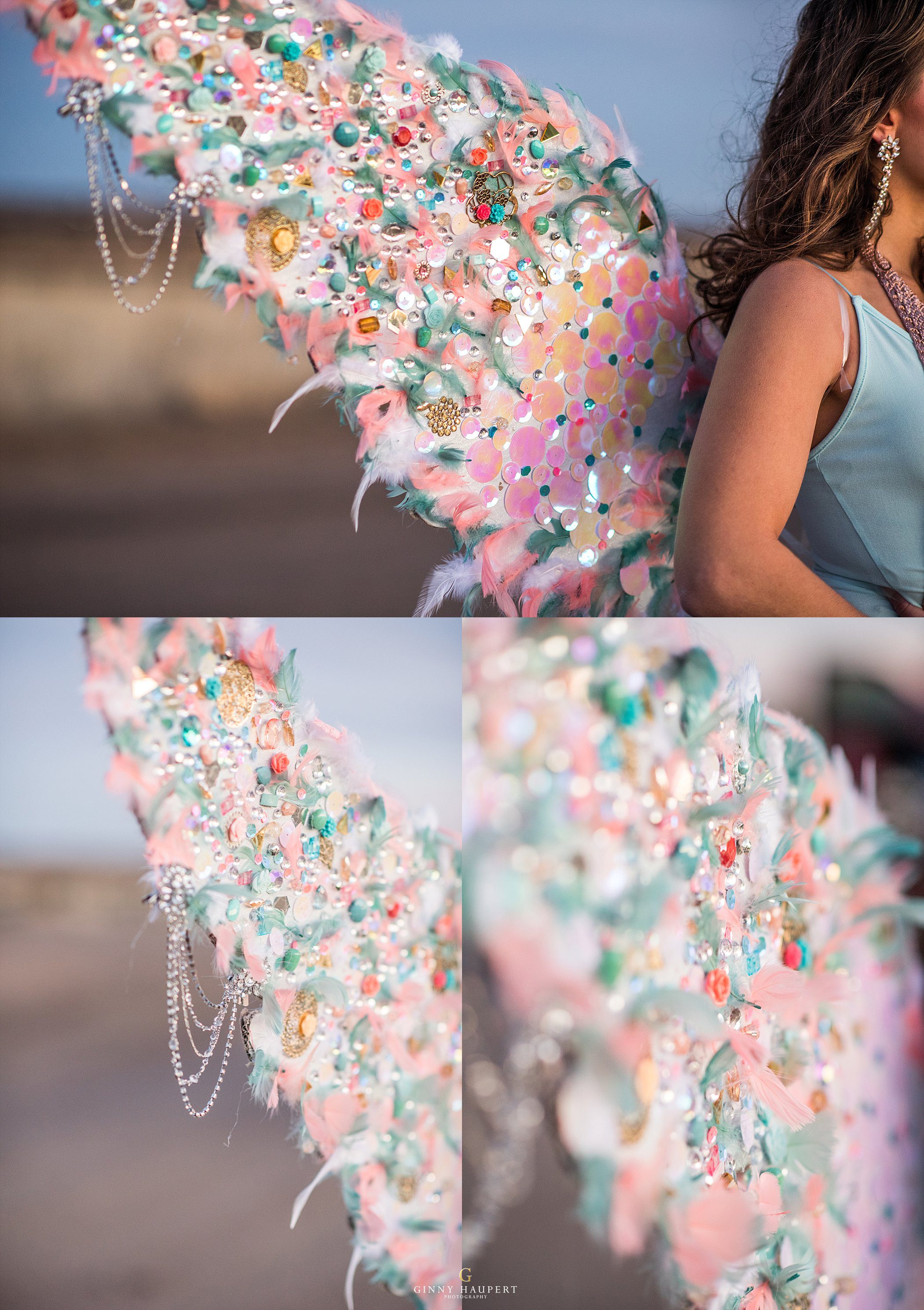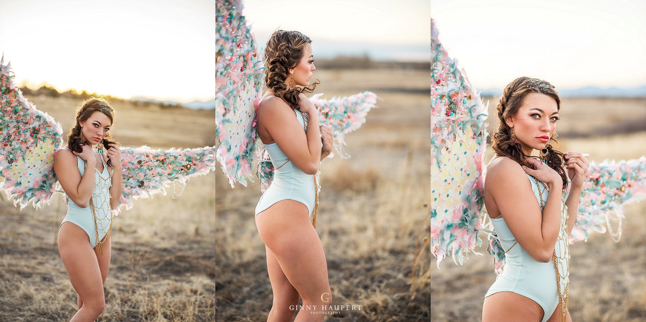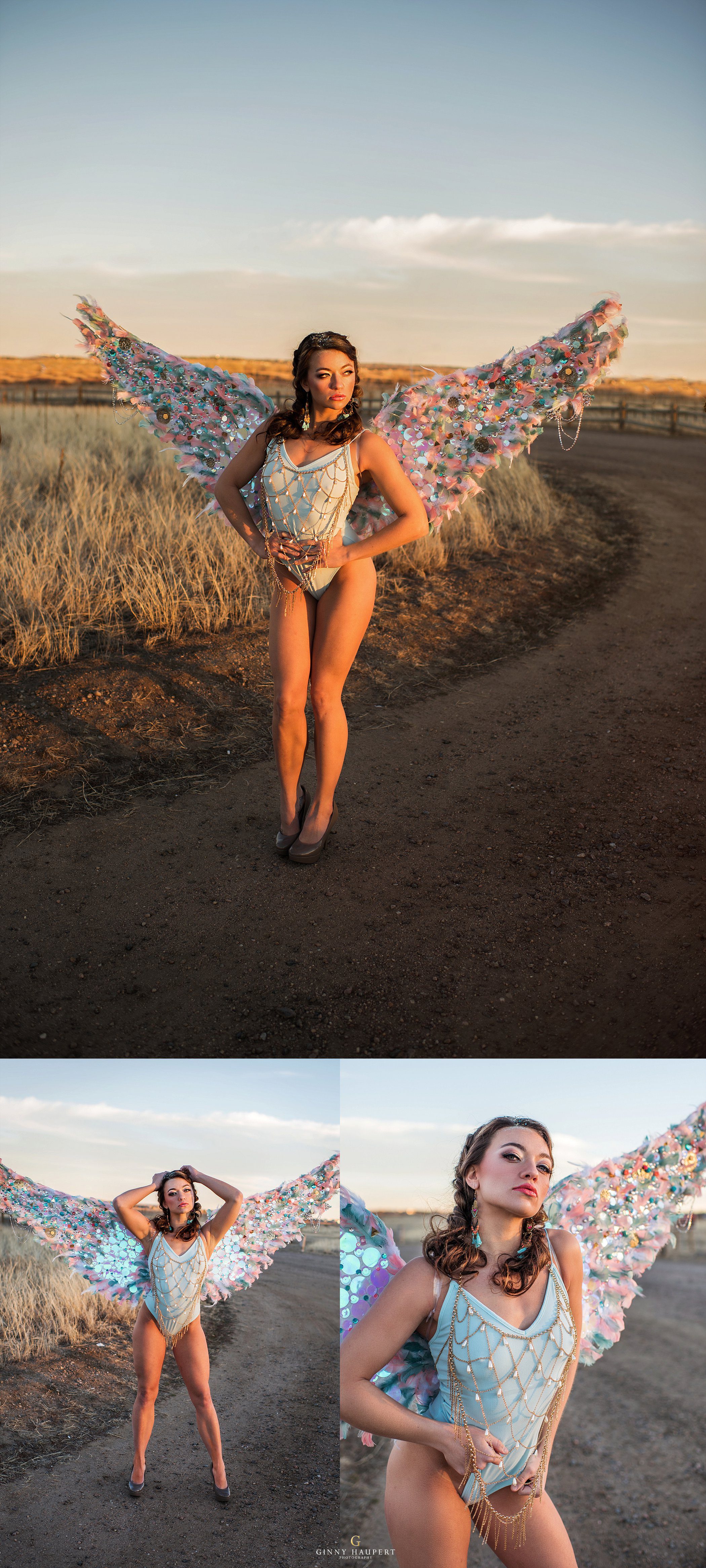 We went to hobby lobby and picked up a TON of pretty things such as, buttons, stickers, sequins, and gems. All of these items would be glued together to create a pair of glamorous angel wings. It was a long process and we both endured a lot of hot glue gun burns. Results were totally worth the work. These would be paired with a pretty gold body necklace and light blue bodysuit. Nikki gave Lauren a glitter part, peachy eyes, and glowing skin. When it came time to shoot this look we were all a little bit worried for Lauren because it was February and the wind had kicked up something fierce! She was such a trooper and modeled anyways for us. We made sure to cover her up as much as possible between takes. You will see some of that in my behind the scenes shots.