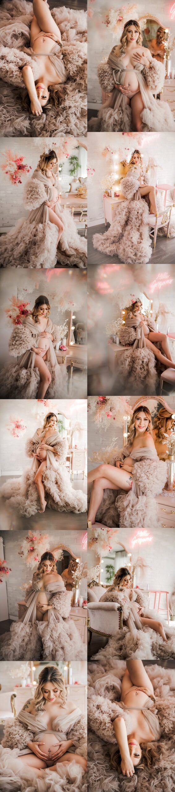 Castle Rock Maternity Photographer Ginny Haupert, has been photographing women for over 10 years. Her love for working with women started at an early age. While in high school, Ginny attended cosmetology school. She then spent the next 8 years helping women feel beautiful as a hairstylist. When Ginny found her passion for photograph she quickly learned that she could put the two together and now she specializes in female portraiture. The last 10 years, she has collected gowns and accessories for her clients to use which takes the guesswork out of finding something to wear. Many of her gowns are couture and one of a kind. She has gowns for all sizes as well! This mama chose a beautiful light dusty blue tulle robe for one of her looks. This robe fits xs-xl! For her second outfit, she chose a mauve couture ruffle robe. This gown fits sizes xs to xxxl. It has quickly become a client fav at the studio! Ready to book your shoot? Click here and fill out the contact form!