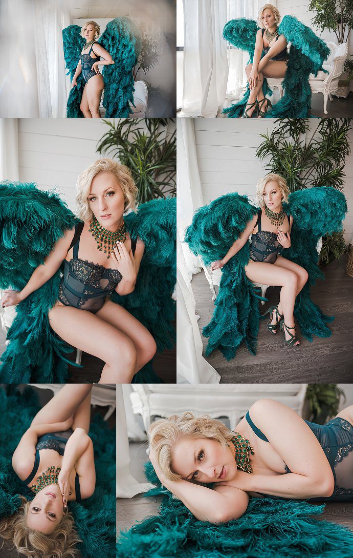 Mrs. L’s first look was so soft and glam. Because her robe was so over the top, we had to go big with the set design. This little vanity set sets a mood straight out of Paris. The angel wings are such a fun addition to any shoot. Many of us grew up watching the Victoria Secret Fashion show and dreamed of wearing a pair of those runway wings. We have over 10 options for wings, some even being authentic from VS! We wanted to finish the shoot with some more moody images. I paired her black strappy outfit with my gold/green vintage set. It creates a glamorous but sexy vibe. The last look was so different and so much fun in our neon room. Here we play with color, light, and sparkle. Did you notice those boots!? They are available in the GHP wardrobe!