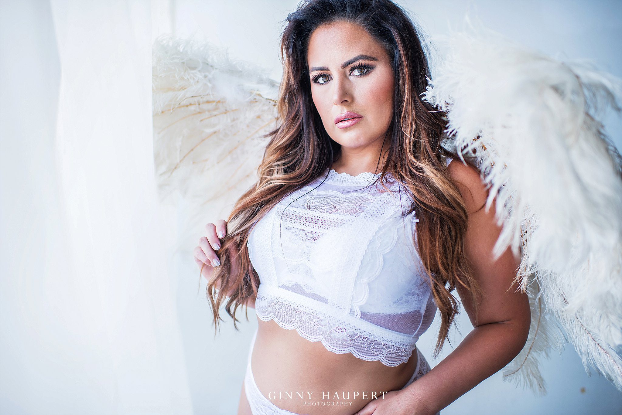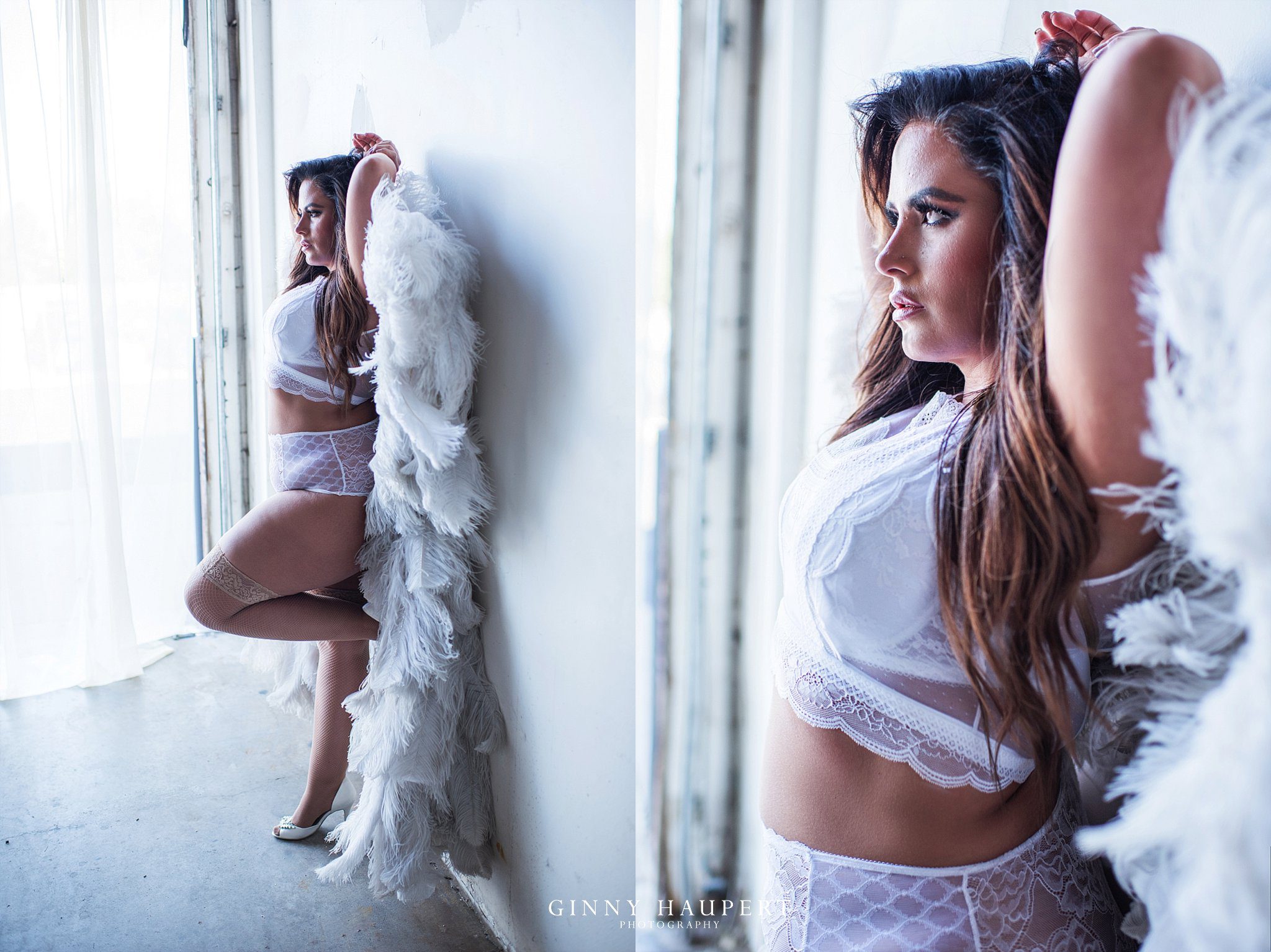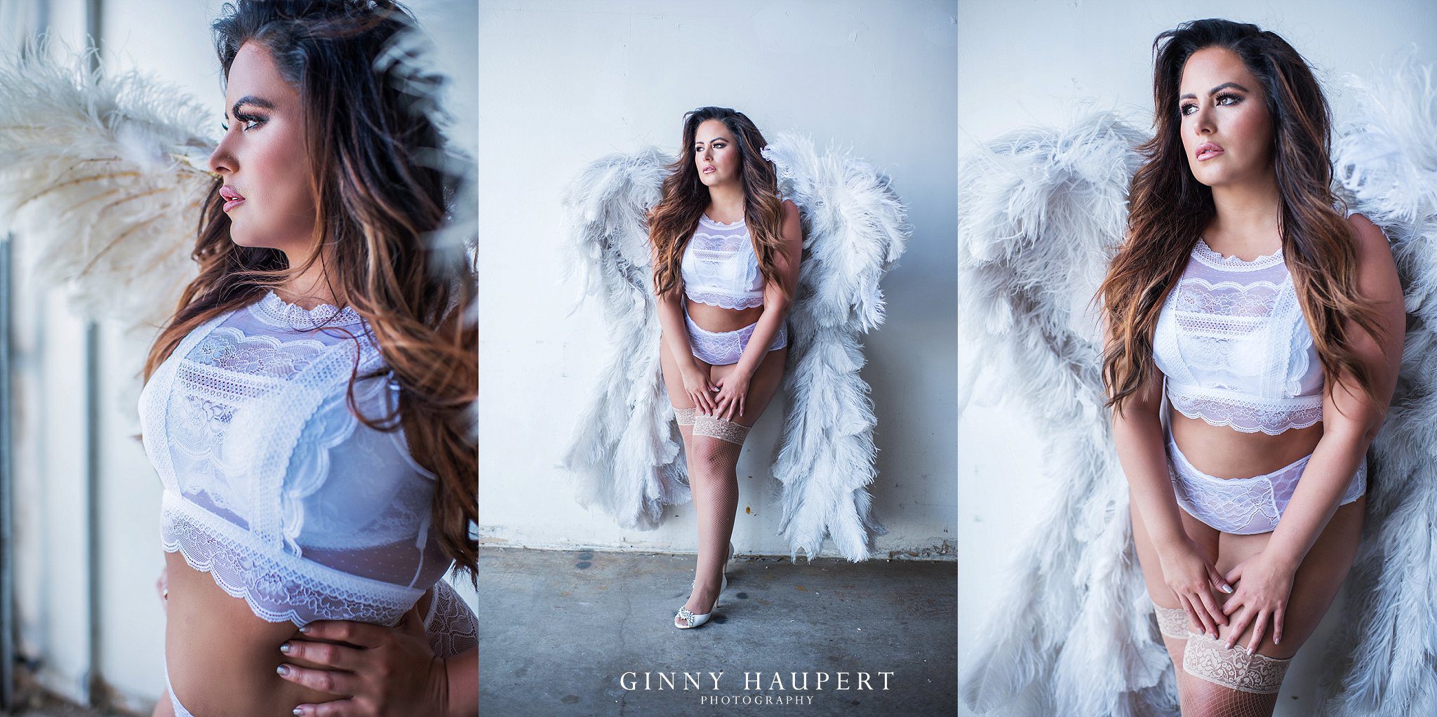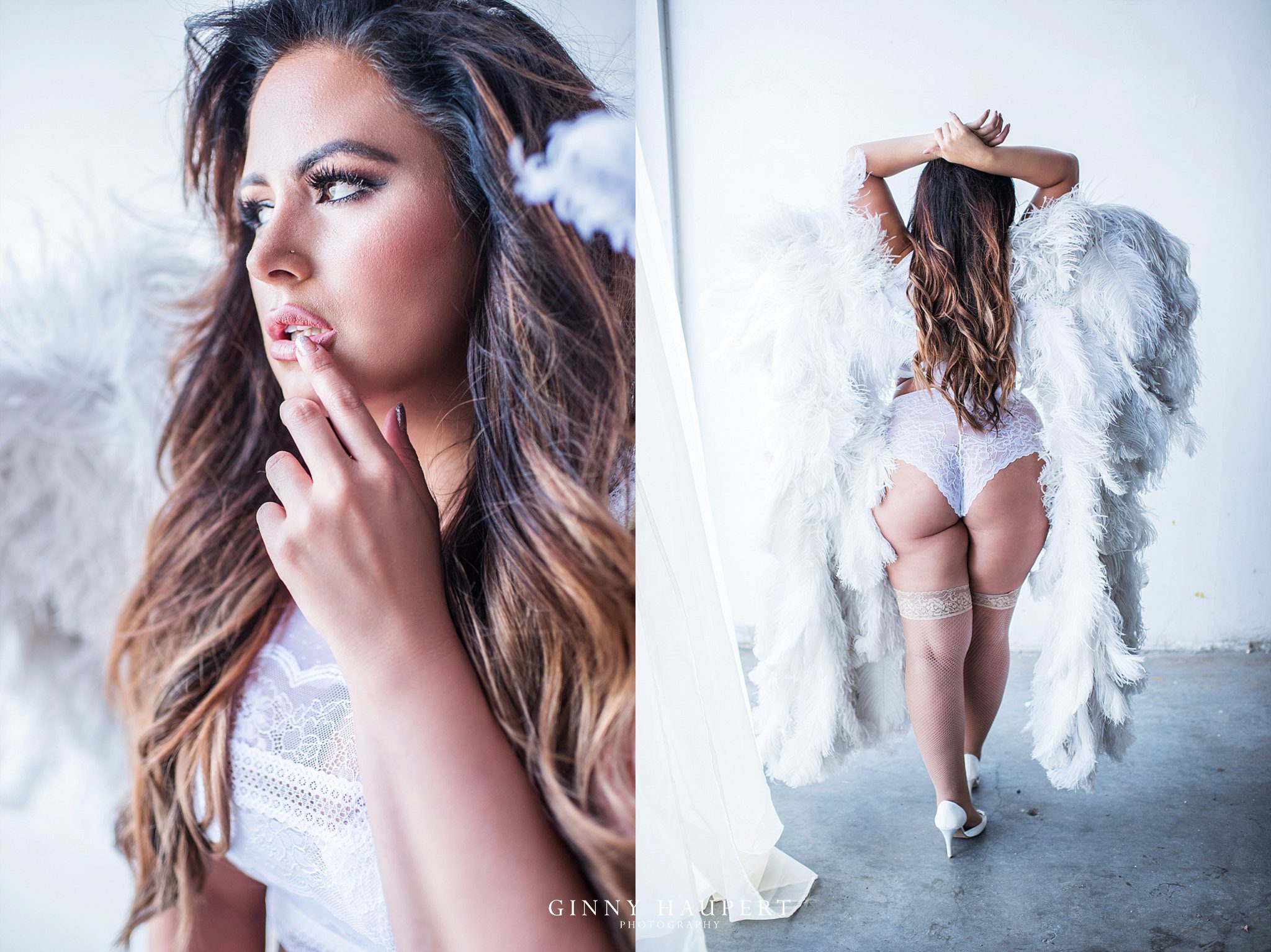Ms. D’s shoot was one for the books. Her choice of wardobe was so diverse therefore, she had an amazing variety of looks to order from. One of my favorite outfits was her coral bra and panty set which came from Fredericks of Hollywood. The color popped against her beautiful skin tone and also the wood plank wall. I also knew we had to rock some wings for her boudoir session because her white outfit screamed angel! I threw a little fan on her because I wanted to give her that extra super model look. Ms.D confidence really came out the more we shot which I love to see! Her man is going to be obsessed with these! Which look is your favorite?