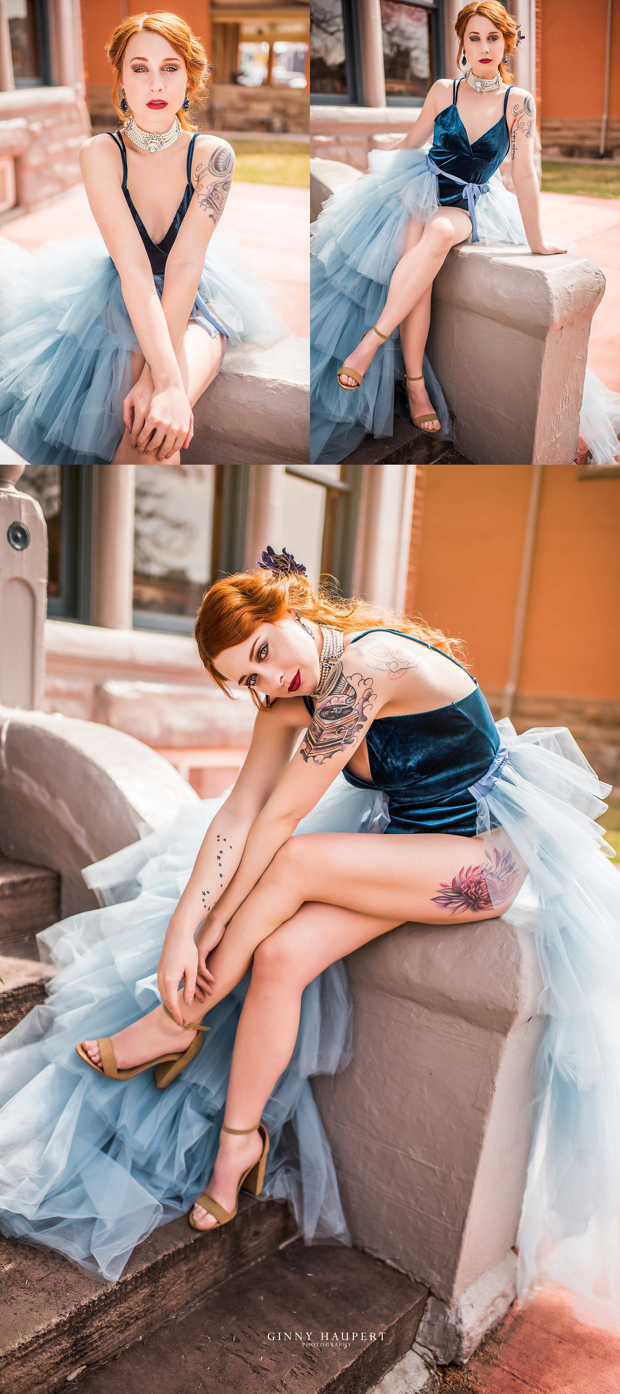 The third look was a Victorian style with finger-waves and a gorgeous blue tulle skirt custom made by Leah Maria Couture. We followed that look with an over-sized black glamour robe again made by Leah. All of these outfits are available for you to use at my studio!