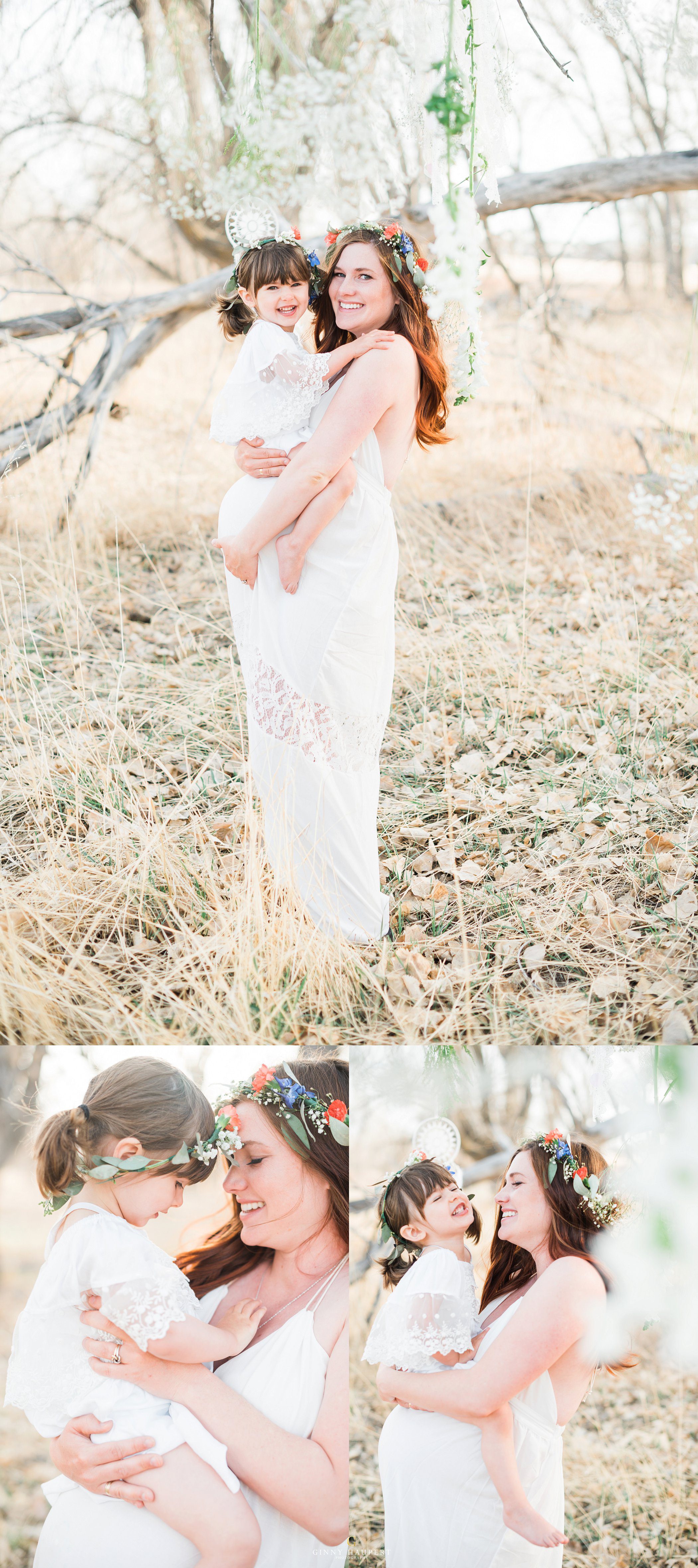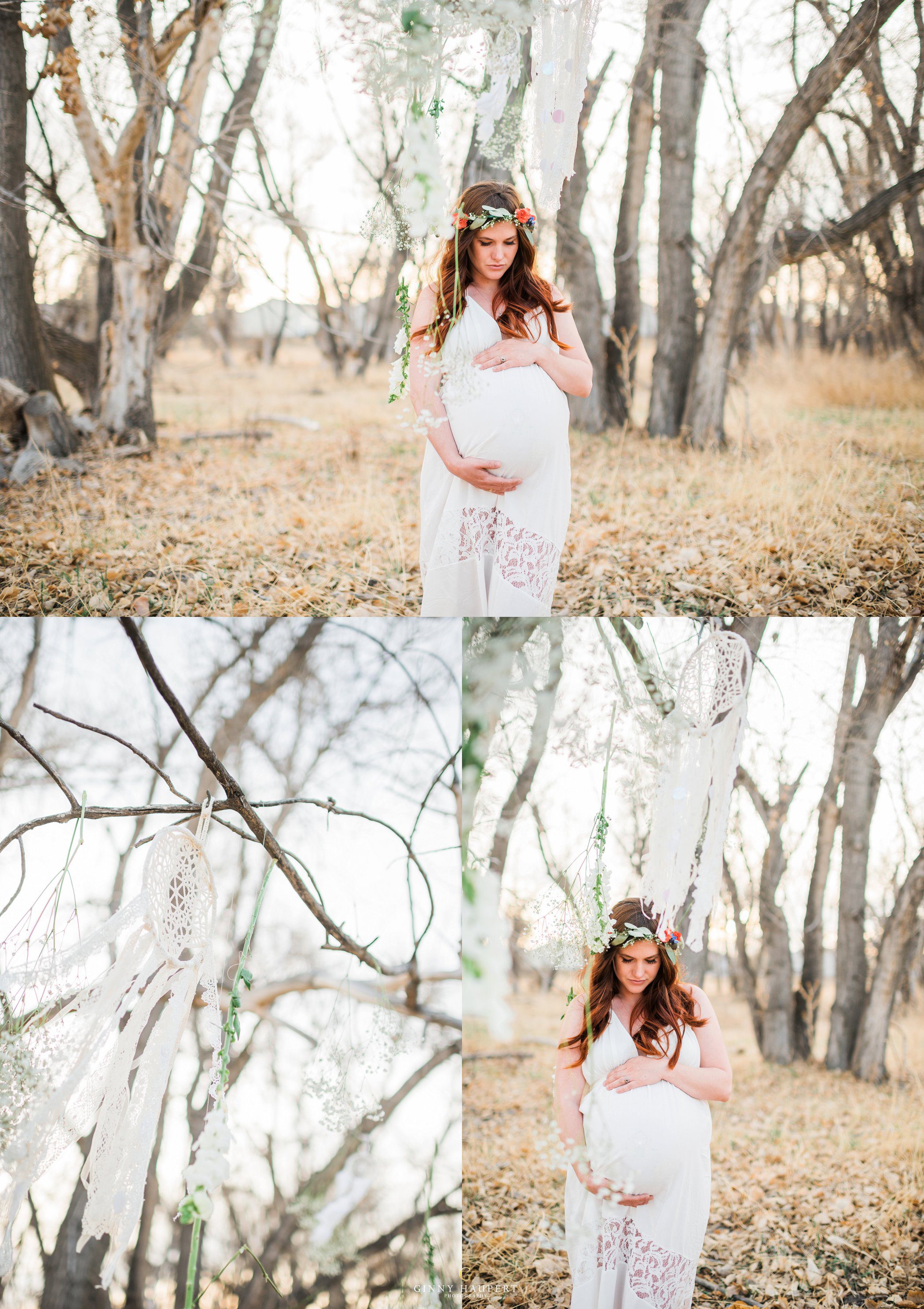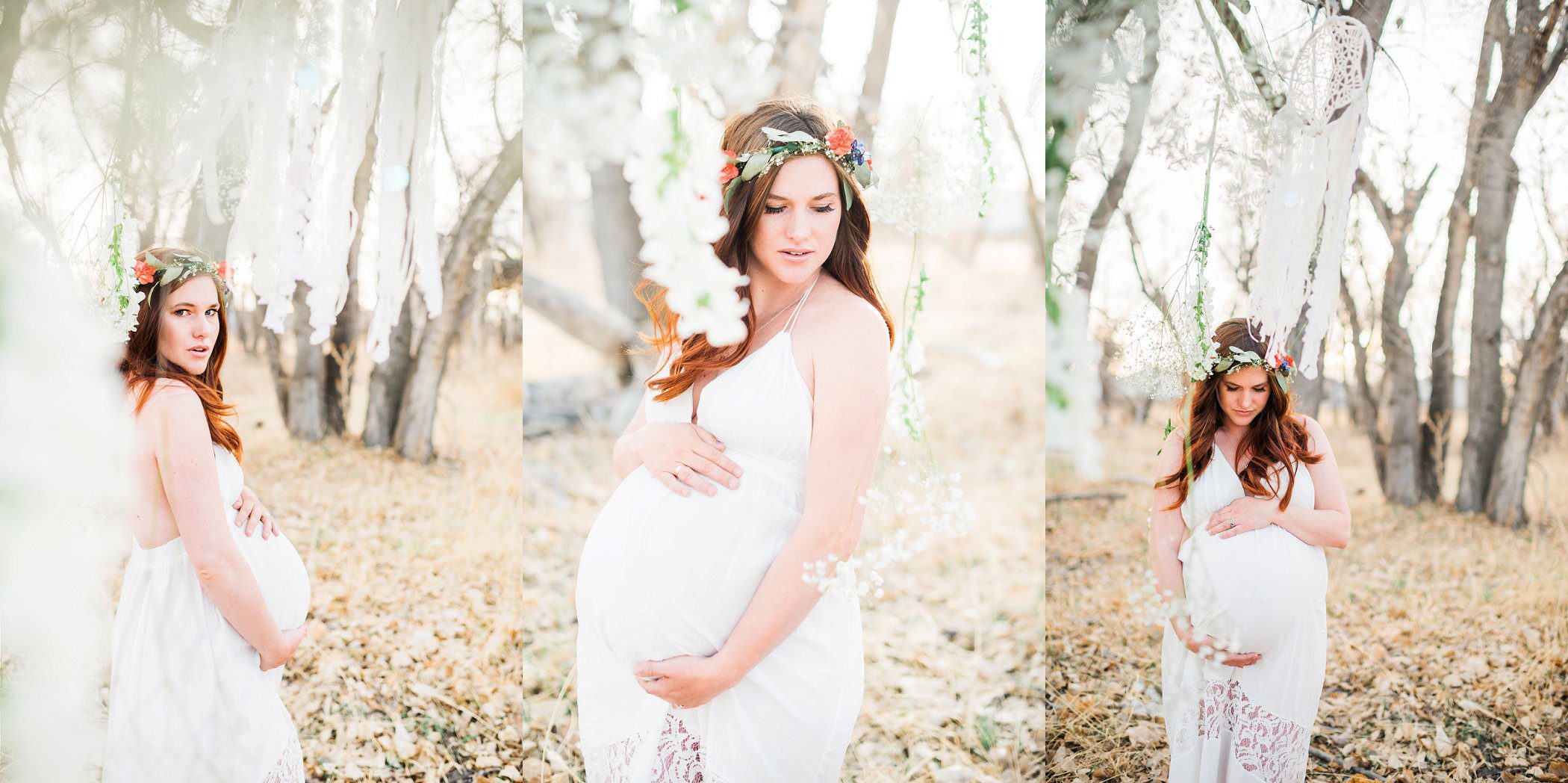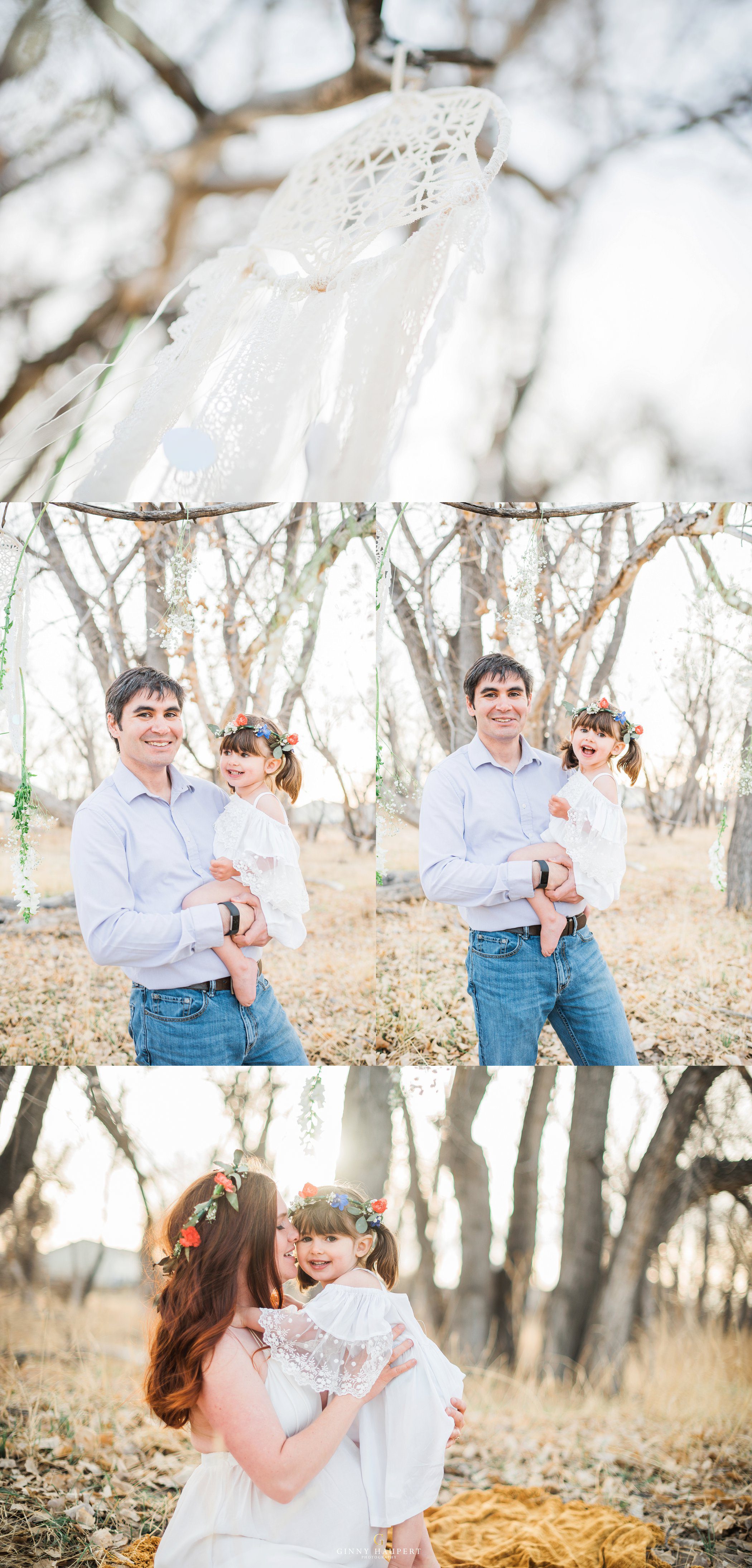 This session was so beautiful in so many ways. This mom is also an amazingly talented photographer and videographer. She has one of the kindest souls I have ever seen. For her Denver Maternity Session we decided to give her a ton of variety. We started her Denver Maternity session with some lifestyle images. I love the honesty and casualness of these on the couch. She looks amazing in just her sweater! Next up was a sweet delicate lace look. Very ethereal. We then put her in one of my white studio maternity gowns. The white against the green of my vintage sofa was just dreamy. Her eyes popped intensely! We also did a few topless that was very tasteful and had almost an editorial feel to it. Reminded me of a Calvin Klein ad. I had always wanted to do a bohemian style maternity shoot. She was so kind to take me up on my ideas. We put metallic temporary tattoos on her tummy and wrapped her in a silky kimono. Throw in the wicker peacock chair and you have boho perfection. One of my favorites in this session for sure! Last but not least we went outdoors with her family to finish up. We hung baby’s breath, flowers, and dream catchers from the tree branches to give a bit of whimsy. I am so in love with all these styles and this momma has some amazing Denver Maternity photos to cherish forever!