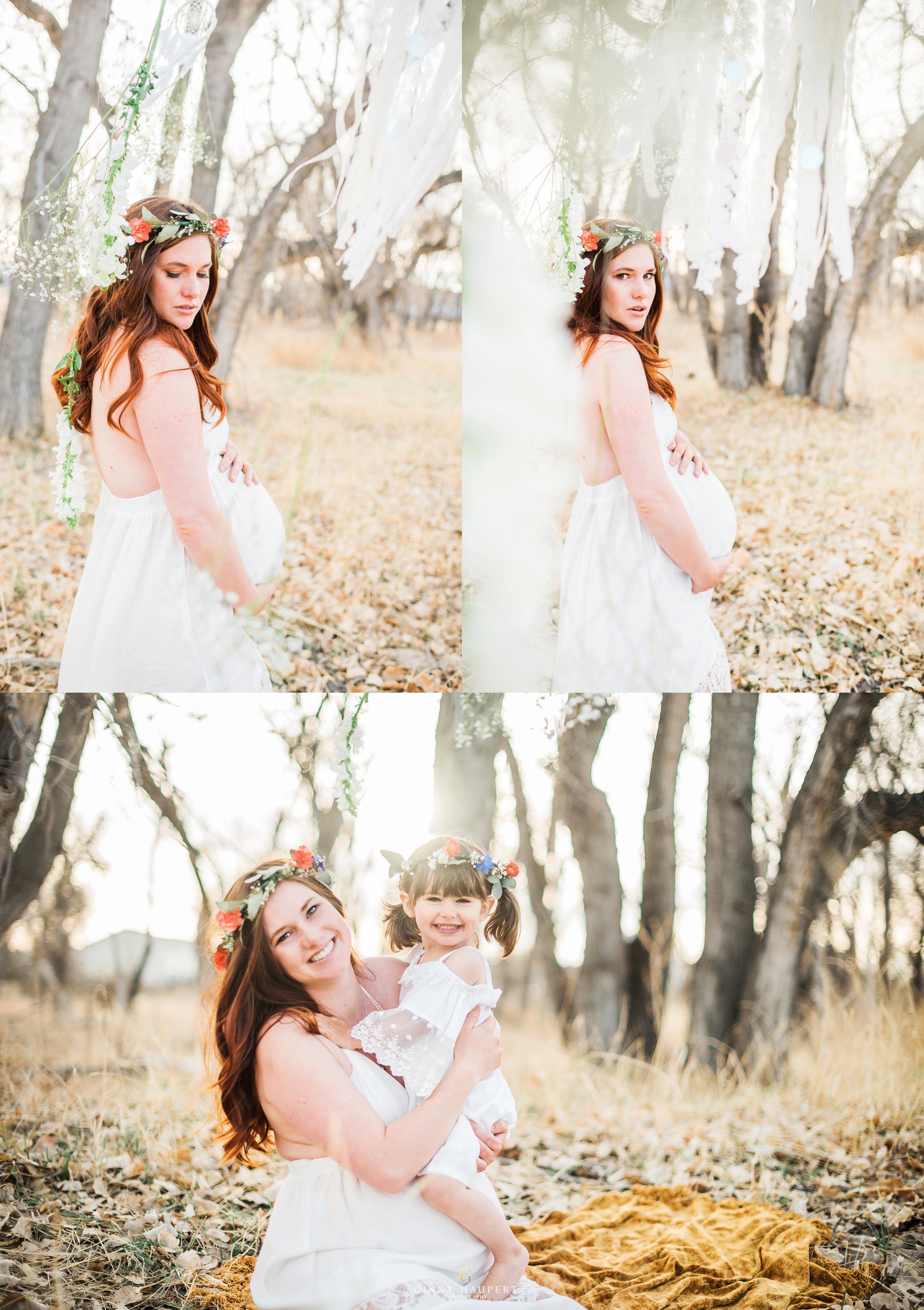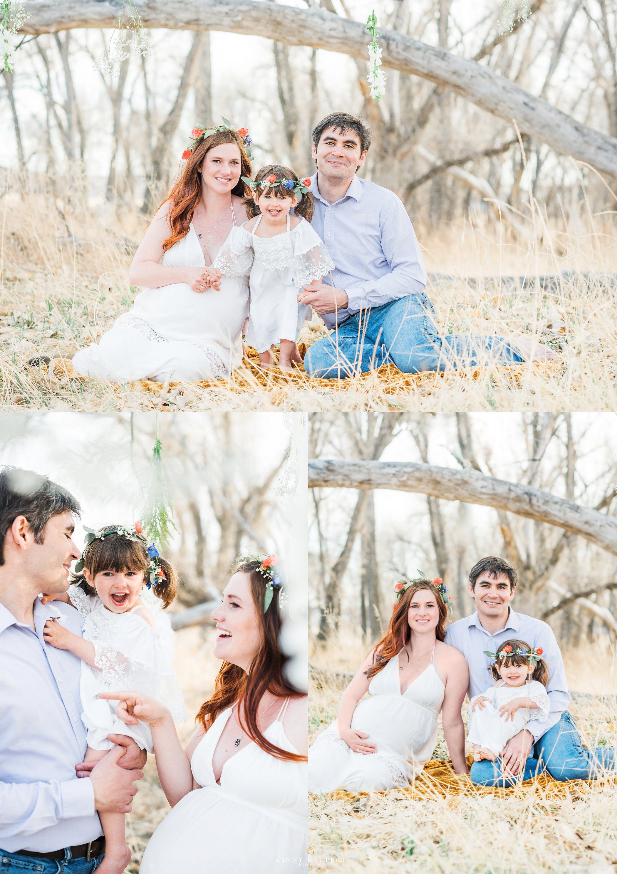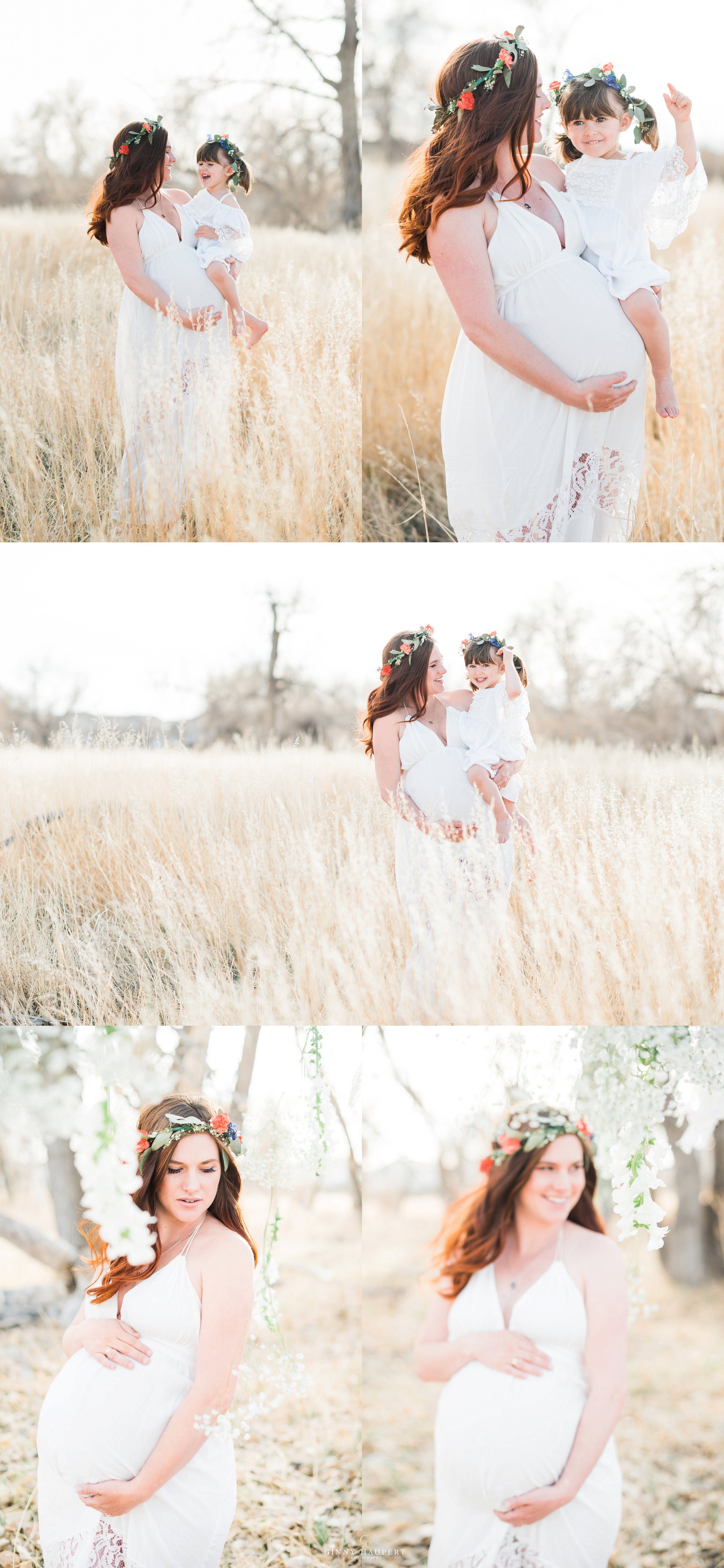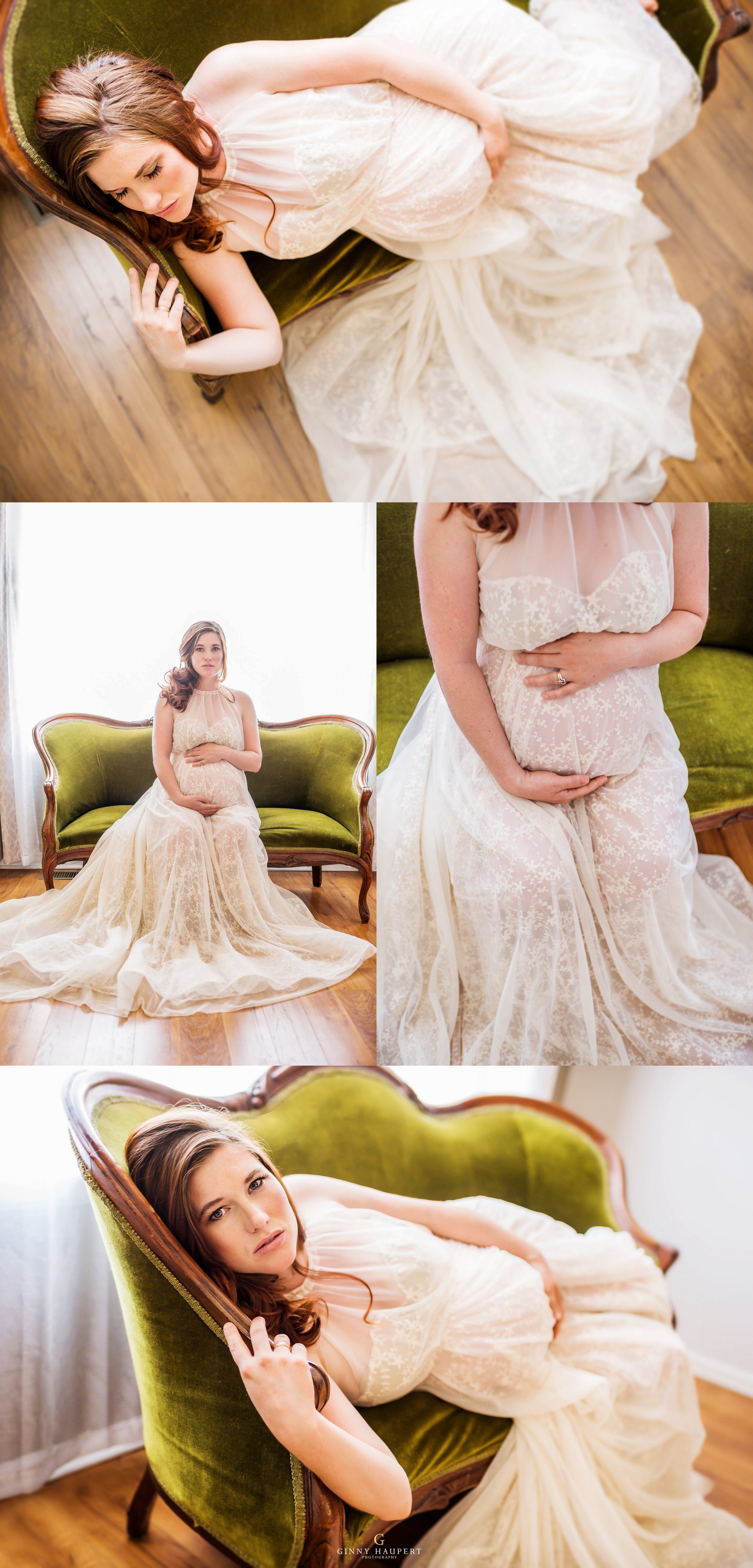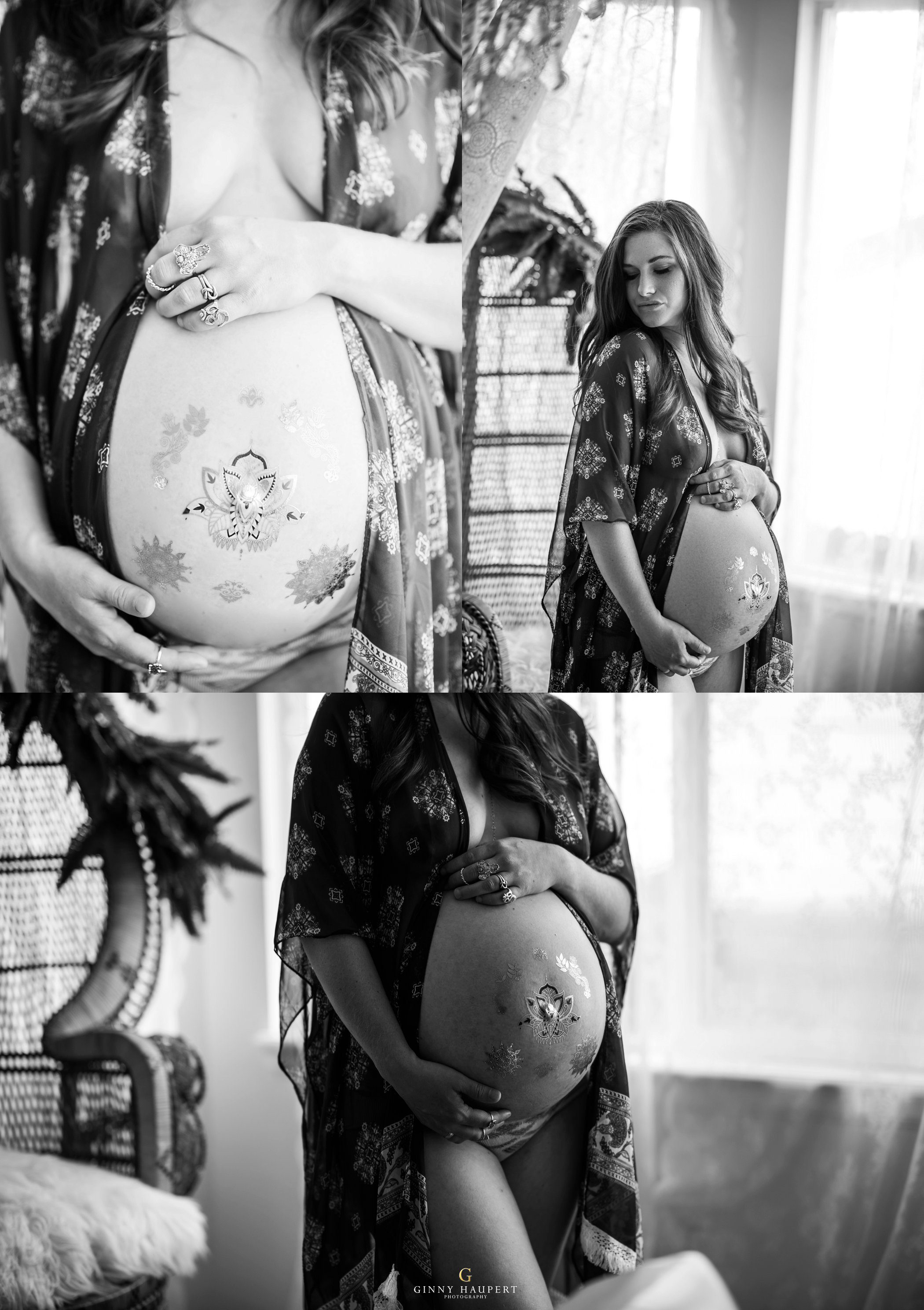 This session was so beautiful in so many ways. This mom is also an amazingly talented photographer and videographer. She has one of the kindest souls I have ever seen. For her Denver Maternity Session we decided to give her a ton of variety. We started her Denver Maternity session with some lifestyle images. I love the honesty and casualness of these on the couch. She looks amazing in just her sweater! Next up was a sweet delicate lace look. Very ethereal. We then put her in one of my white studio maternity gowns. The white against the green of my vintage sofa was just dreamy. Her eyes popped intensely! We also did a few topless that was very tasteful and had almost an editorial feel to it. Reminded me of a Calvin Klein ad. I had always wanted to do a bohemian style maternity shoot. She was so kind to take me up on my ideas. We put metallic temporary tattoos on her tummy and wrapped her in a silky kimono. Throw in the wicker peacock chair and you have boho perfection. One of my favorites in this session for sure! Last but not least we went outdoors with her family to finish up. We hung baby’s breath, flowers, and dream catchers from the tree branches to give a bit of whimsy. I am so in love with all these styles and this momma has some amazing Denver Maternity photos to cherish forever!