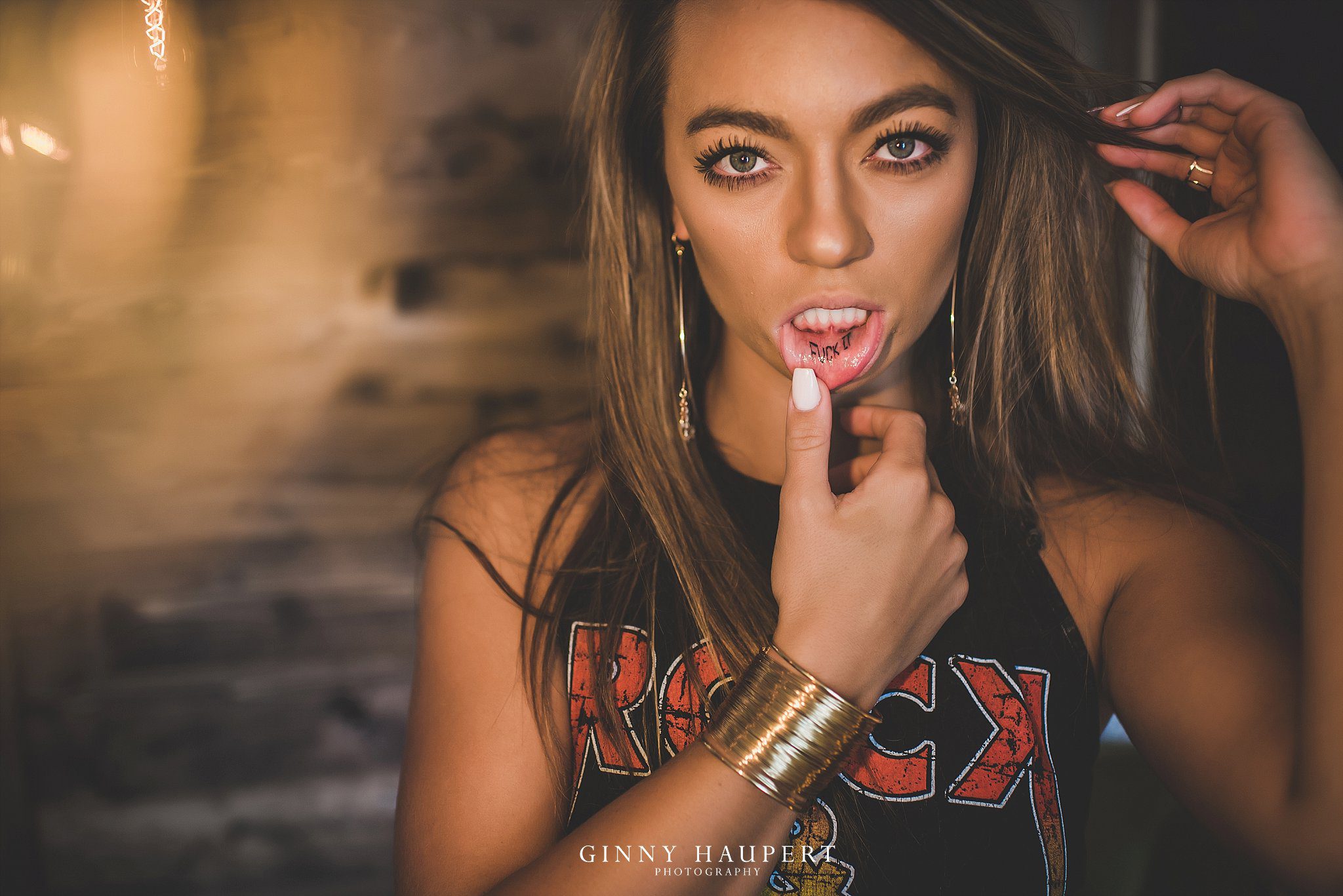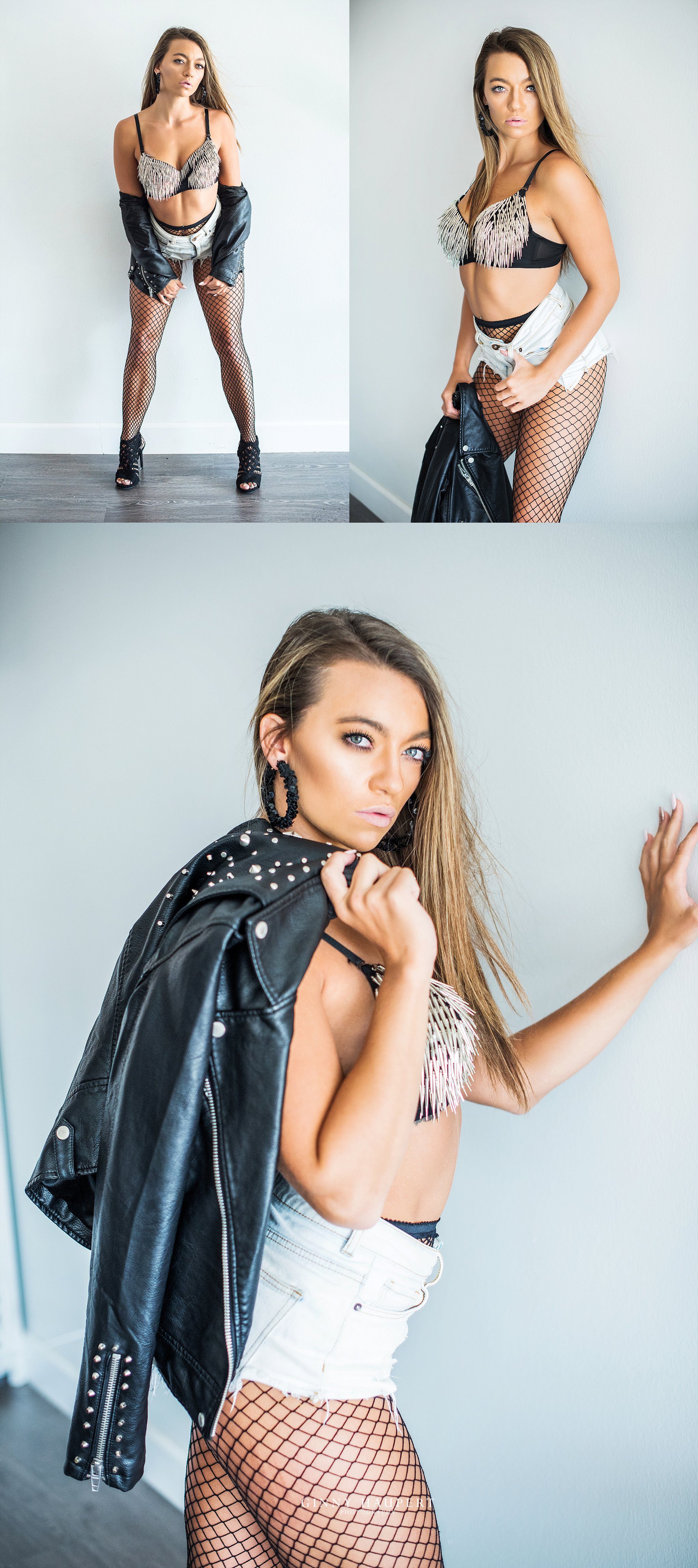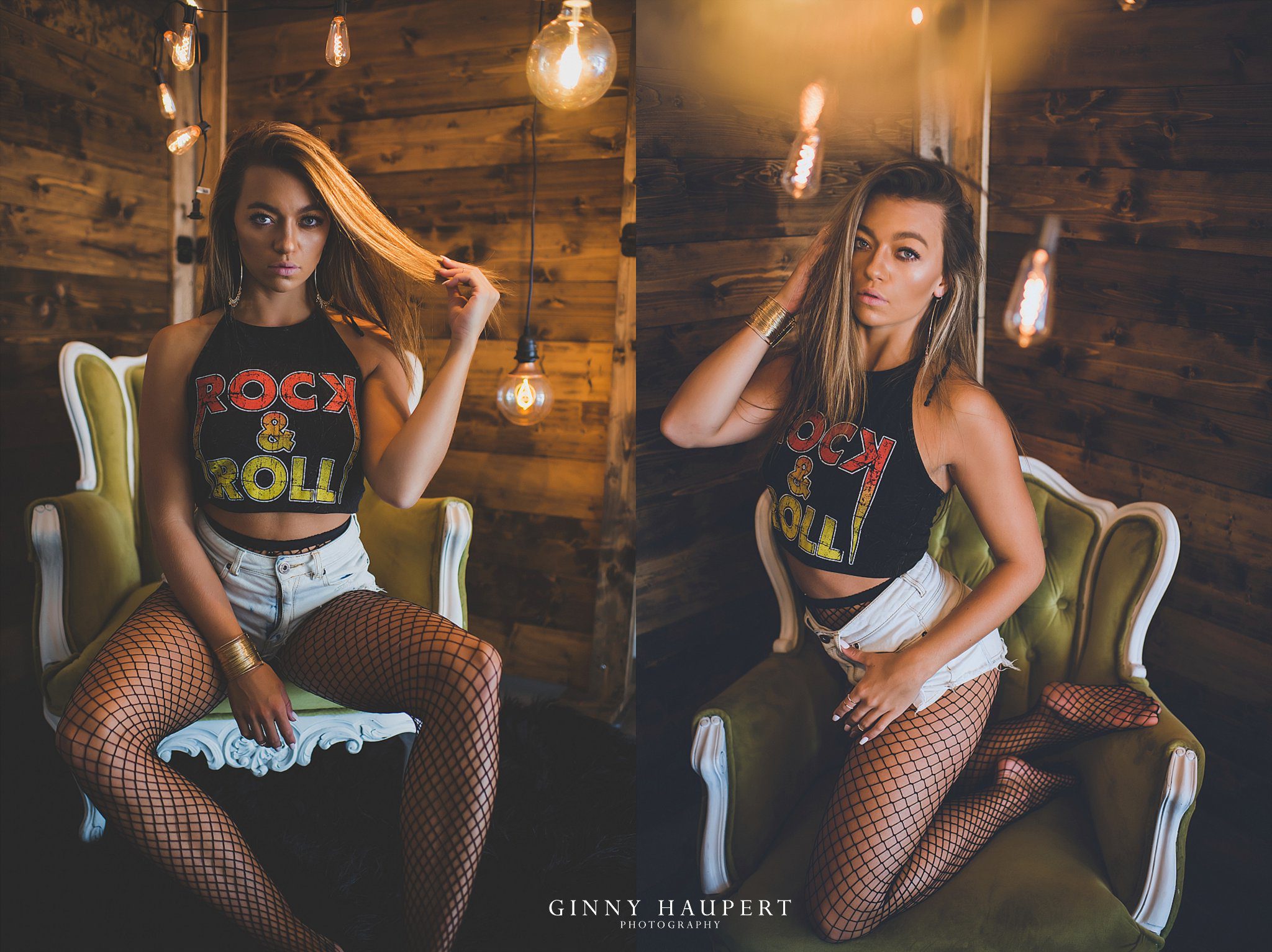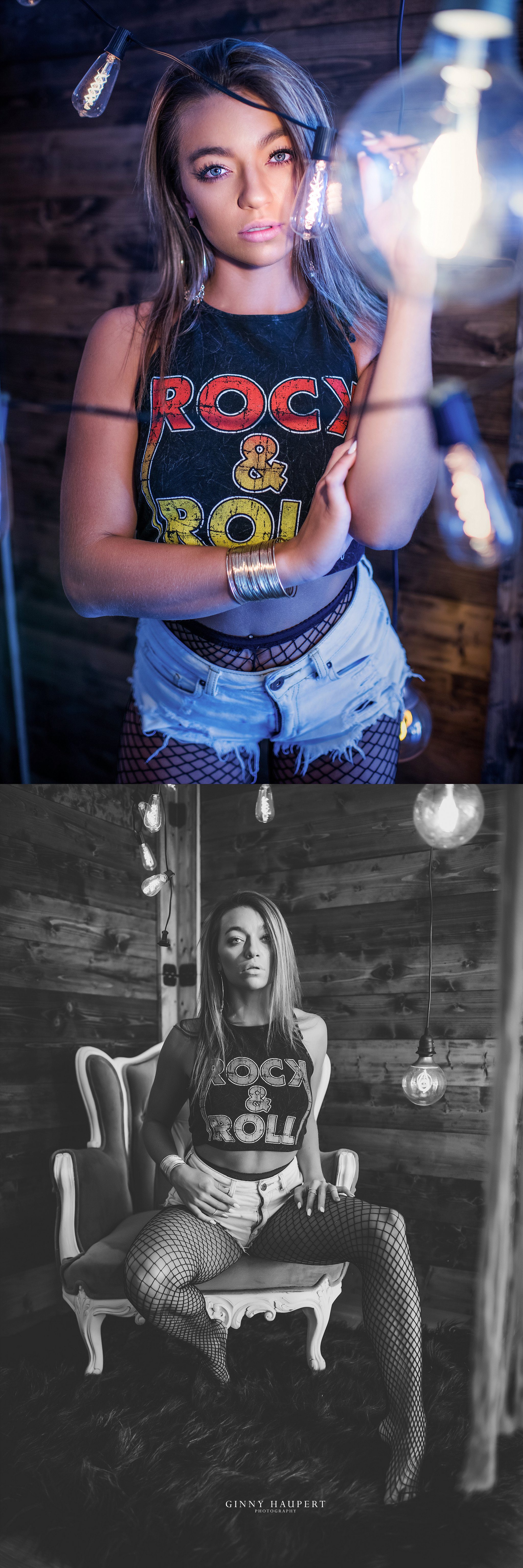 I created this really fun new set with a wood backdrop and hanging Edison lights. Because this is a moodier set, we choose her edgy rock and roll outfits for it. She even flashed her lip tattoo for a shot… shh… don’t tell her grandmother about that one! The spike bra and studded jacket were also from the studio wardrobe and such a fun bad ass look!