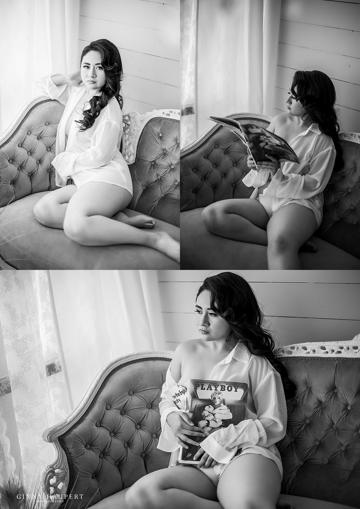 I was so excited when I heard Ms. J wanted a retro-vintage style Pin Up photography session. Because this style is so unique, we made sure we had the perfect wardrobe to help her nail this look. Lucky for her, I had some gorgeous options already in our GHP wardrobe. Her first look featured a satin and ostrich feather robe plus a high waisted lace panty and matching bra, both of which, came from my closet. Adding pearls gave it just a touch more glam!